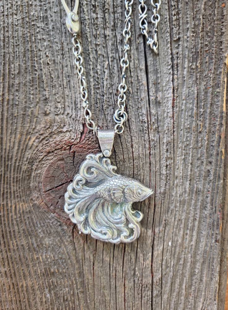 The fish was created using chasing and repousse technique in fine silver. The bale and backing of the fish are fabricated in sterling silver. Natural diamonds are set in both the eye of the fish and the bale.