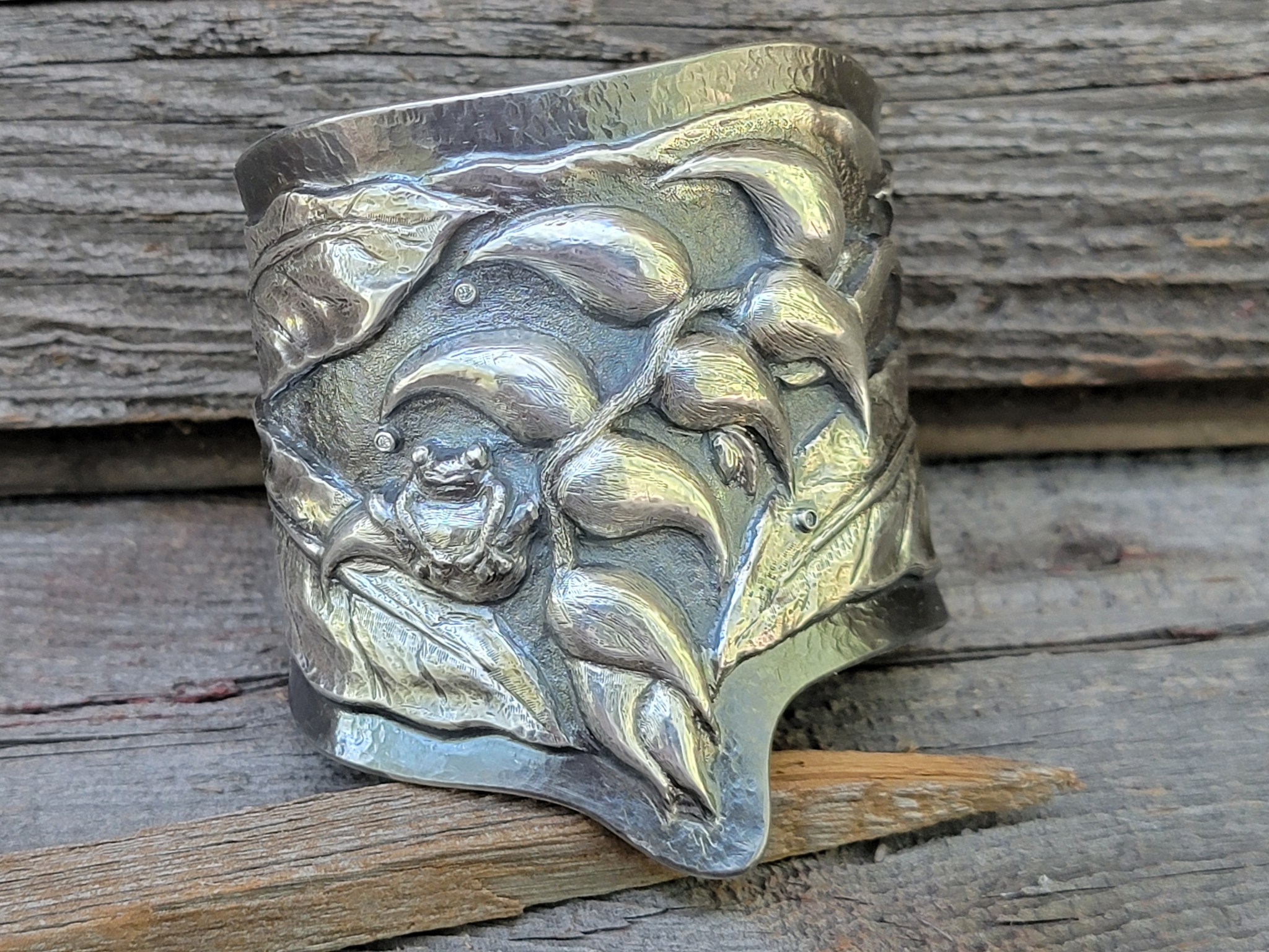 The bracelet is created using chasing and repousse technique in sterling silver.
