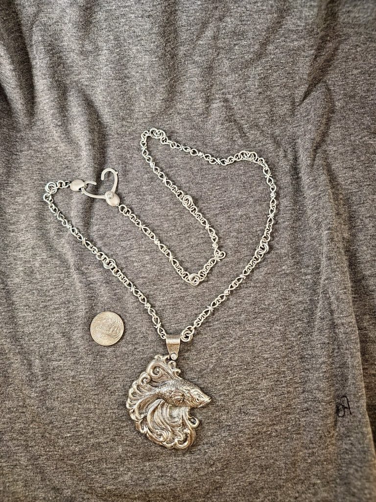 The fish is formed from fine silver sheet. The back of the fish, bale and eye setting are sterling silver. There is one 3.1 mm natural diamond set in the bale and a 1.5 mm natural diamond set in the fish eye. 2 3/8 inch X 2 3/8 inch