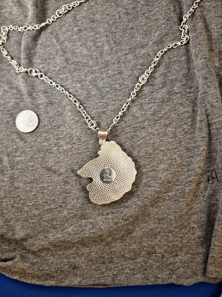 The chain is an original design. It is hand-made of fine silver wire. There are 8 links set with a 1.9 mm natural diamond with a 2.0 natural grey spinel set reverse of the diamond. The sisterhook clasp is hand-made in sterling silver. There is a 3.1 mm natural diamond set on one side and a 3 mm natural grey spinel set on the riverse. 28 3/4 inch